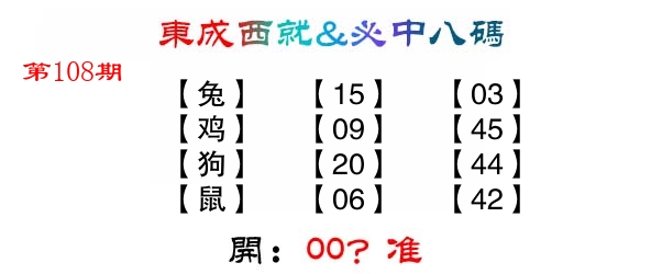 | 108期: ⑧肖 | 狗马蛇龙猪虎羊牛 | ????中 |
