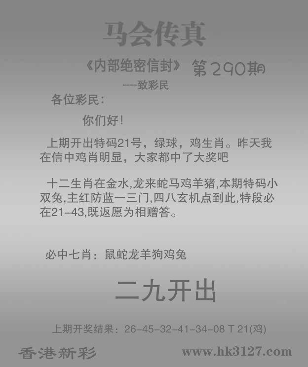 291期: ⑦肖 | 鸡牛狗鼠猪蛇龙 | 猪43中 |